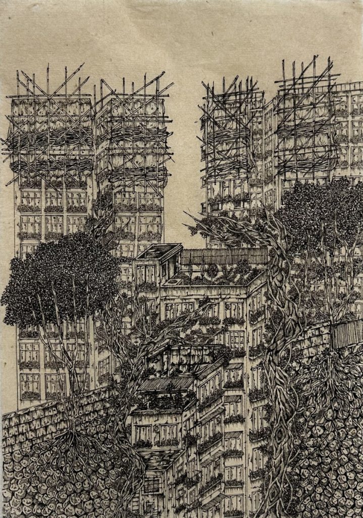 Peony Ng is an artist born and raised in Hong Kong who explores the liminal extrapolations between dream-like elements and urban spaces under construction. Graduating with a BFA from University of Victoria in 2025 and continuing her MFA at Emily Carr University Art + Design, she has been utilizing drawing and installation art as her primary medium.