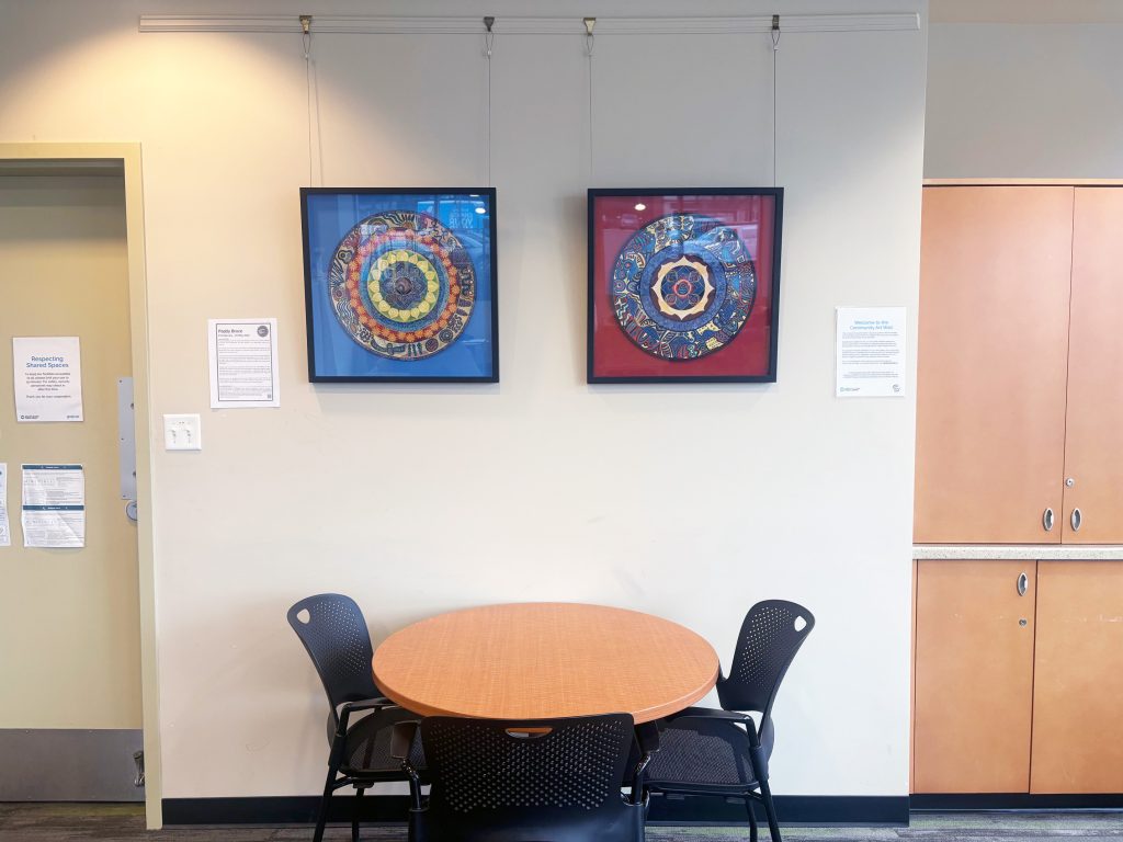 The pieces are unplanned, only the structure of the rings creates the formal elements. The work is about the process not the product. Beginning at the outer ring, known as the death ring or transformation ring, the colors and imagery arrive through a meditative process that is spontaneous and includes a dialogue and journaling with each round.