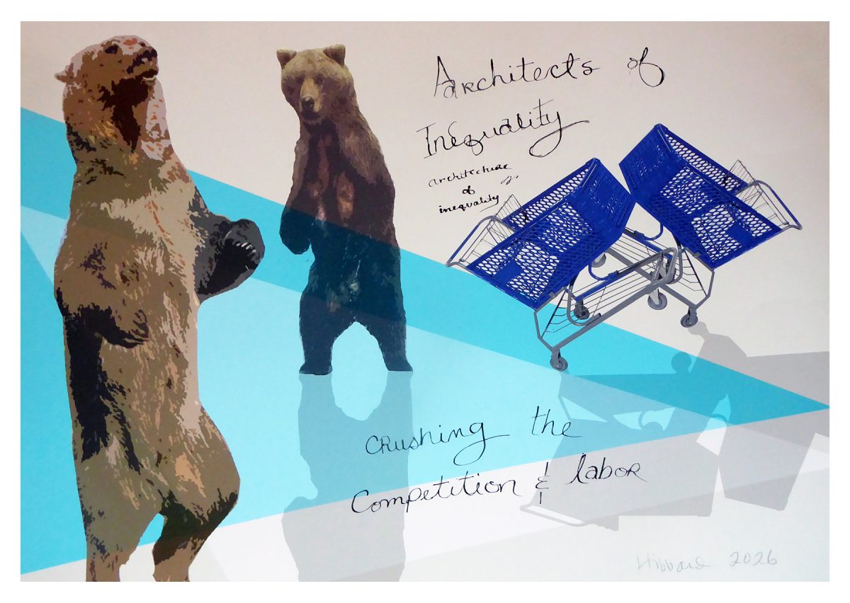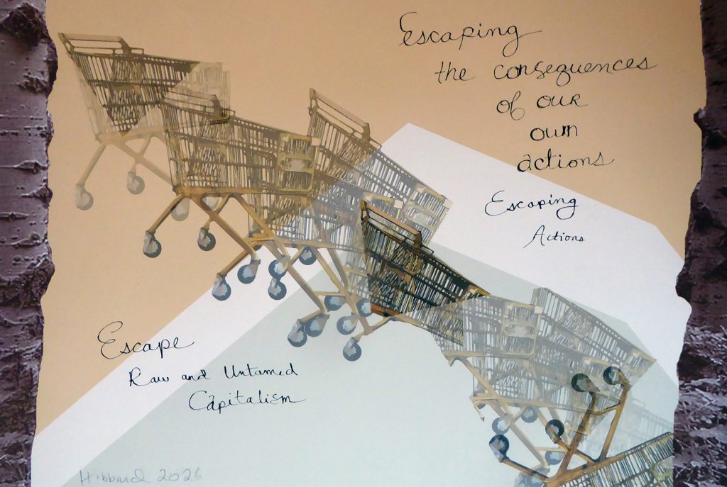 The digital photomontages contain phrases (*see source below) used to critique extreme methods of economic expansion. Often the process is without a thought or care for its impact on others. The images contain animals reacting adversely to these violent changes. The shopping cart is my symbol of a ubiquitous out-of-control presence of economic expansion.