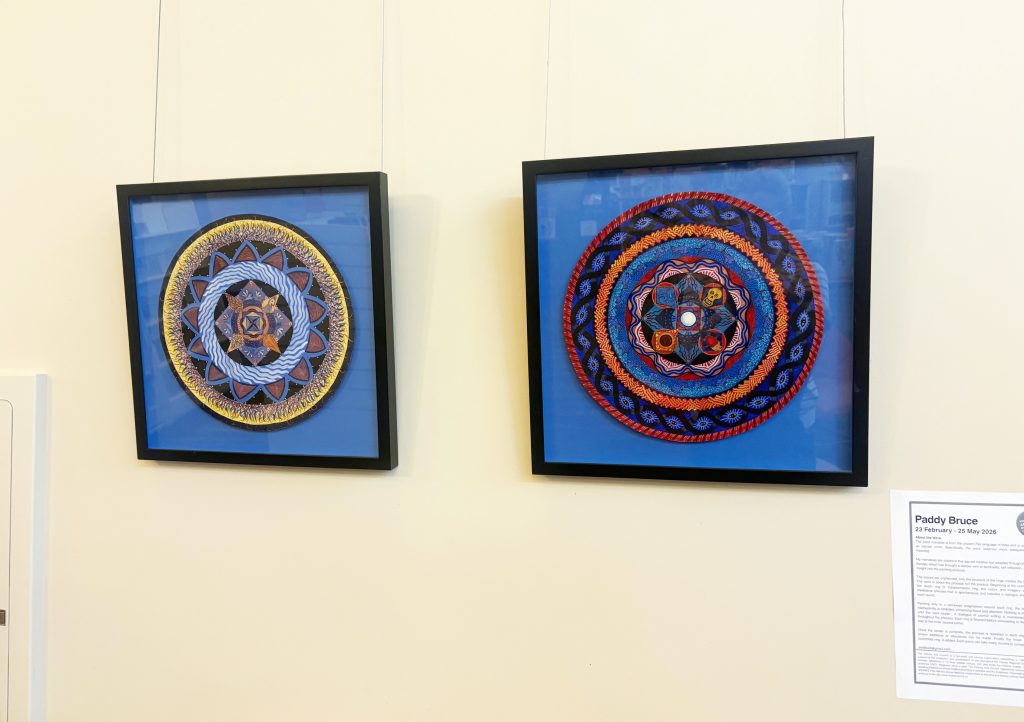 The pieces are unplanned, only the structure of the rings creates the formal elements. The work is about the process not the product. Beginning at the outer ring, known as the death ring or transformation ring, the colors and imagery arrive through a meditative process that is spontaneous and includes a dialogue and journaling with each round.