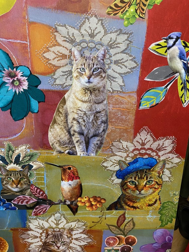 My latest venture of “collage” is salvaging unwanted, damaged and unloved canvas prints and original artwork from thrift stores, flea markets, and garage sales and bringing them back to life in a whimsical and uplifting way. I am absolutely inspired by nature’s bounty of birds, bees, butterflies, flowers and trees. All resources used in the collage come from recycled print materials (books, cards, calendars, & magazines), assorted costume jewelry and fabric ends. The process of collecting, sorting, cutting, selecting, and embellishing with appropriate items involves hours, days, or even weeks but when it comes together it is a magical experience. My hope is that these whimsical collages will make someone smile, inspire a conversation with a stranger, and ultimately live on and on in some other way and at some other time!